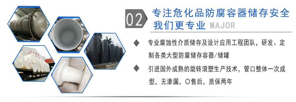 公司有鋼襯塑PE/PO、PE全塑、碳鋼、不銹鋼四大系列100多個品種,專注于常壓儲存容器生產,其產品包括鋼襯塑儲罐、管口一體成型PE儲罐、碳鋼儲罐不銹鋼儲罐、反應釜、攪拌罐、離子交換柱、鋼襯PE/PO儲罐塑料儲罐鹽酸儲罐、硫酸儲罐等等。更大限度滿足廣大客戶的各種需求,同時可以根據客戶的需要加工定制各種防腐設備。